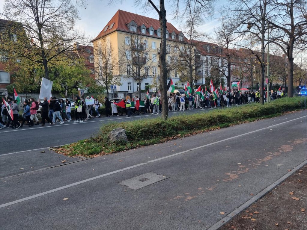 Hier können wir mit gemischten Gefühlen eine propalästinensische Demo verfolgen. Es scheint nicht möglich zu sein, sich für die palästinensische Bevölkerung im Gazastreifen einzusetzen, ohne sich als antisemitisch oder islamfeindlich zu positionieren. Wir würden gerne für die humanitäre Seite demonstrieren.
