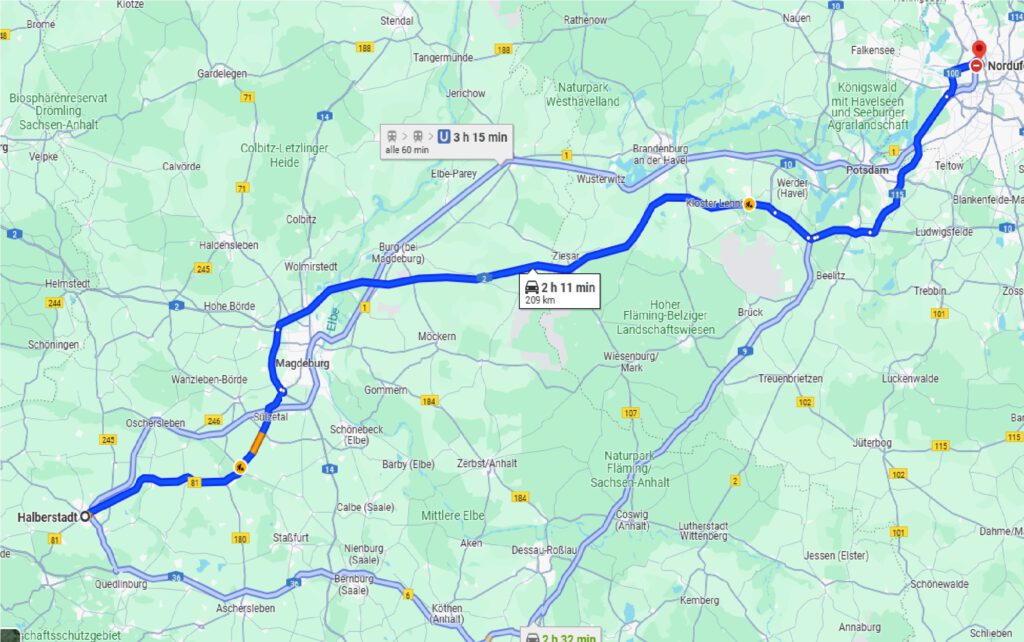 Nach dem Frühstück sagen wir Halberstadt ade und machen uns auf in Richtung Berlin. Nachdem der Harz nun hinter uns liegt, kommen wir auch recht flott über Autobahnen und zweispurige Kraftfahrstraßen bis Magdeburg und dort auf die A2 in Richtung Berlin.