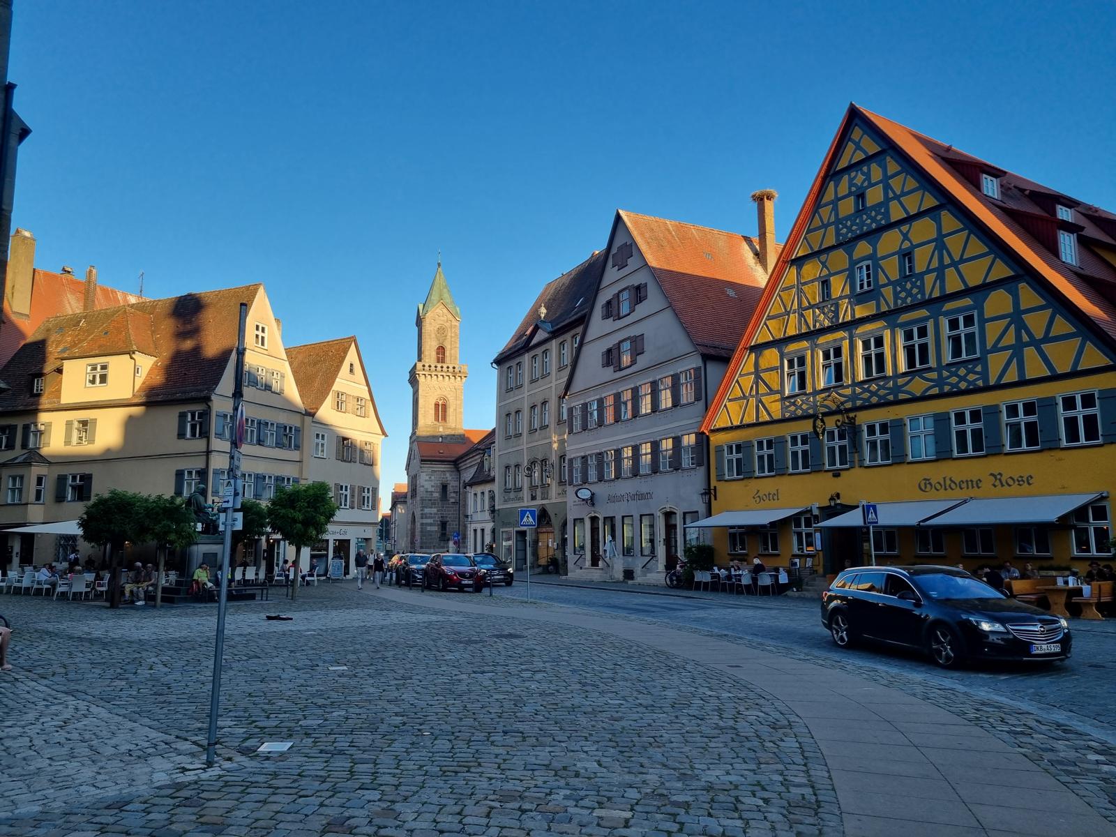Wir wollen noch bis Dinkelsbühl, das wir beide nicht kennen. Kurz vorher fahren wir ca. 2 km an dem riesigen Festivalgelände vorbei, an dem nächstes Wochenende das Summerbrezze stattfindet. Am meisten beeindruckt mich eine kleine Stadt aus Dixie Klos. Es dauert eine Weile, bis wir uns zurechtfinden, denn Dinkelsbühl ist aktuell ein Gewirr von Umleitungen und Sperrungen, aber am Ende finden wir doch noch einen nicht ganz korrekten Platz auf dem ortsnahen Womo Stellplatz. Von hier aus geht’s mit den Rollern in die Altstadt, keine perfekte Idee… Hier herrscht Kopfsteinpflaster vor. Habe ich schonmal beschrieben, wie man sich fühlt auf einem Elektroroller auf Kopfsteinpflaster? Da fliegt einem das Gehirn weg und die wunderschönen Häuser von Dinkelsbühl sehen aus wie früher das Testbild im Fernsehen nach Sendeschluss.