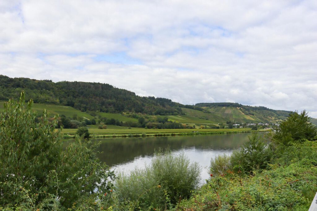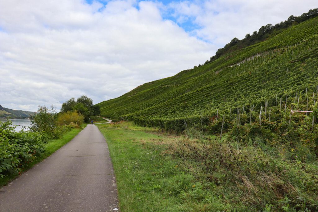 Mit der Bahn sind wir recht schnell vor Ort und finden dank Komoot auch schnell die Moselbrücke. Hier ist es deutlich ruhiger. Die Straße ist auf der anderen Seite der Mosel. Eigentlich so wie ich mir das vorgestellt habe. Radweg, Weinberge auf der einen Seite und die Mosel auf der anderen Seite. Schön!
