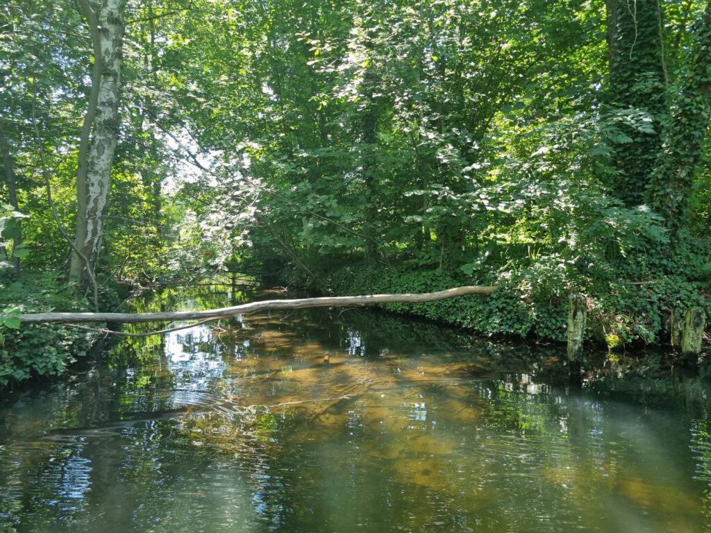 Wir fahren auf den Vorschlag von Komoot hin ein Stück den Gurkenradweg gen Norden. Irgendwie ist es hier auch zwar schön, aber nicht so romantisch. Seit Jahren träume ich von verwunschenen kleinen Kanälchen, über die Geäst hängt und die Sonne seltsame Lichter ins Wasser malt. Die Sonne tut das wirklich, aber die kleinen Kanäle sind vom Fahrrad nur ab und zu mal von einer Brücke aus zu sehen. Irgendwie erinnert mich das an „Instagram vs. reality“. Vielleicht finden wir morgen Stellen, die unserer Vorfreude eher entsprechen.